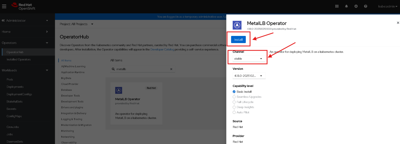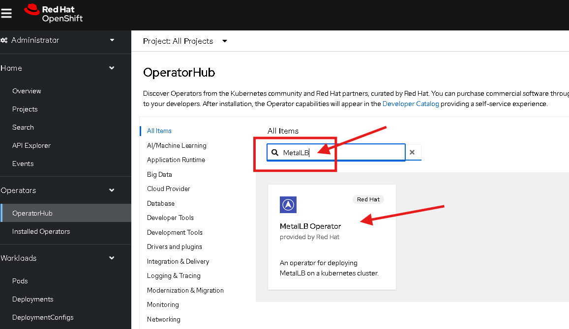 MetalLB Operatörünün kurulumu için, Openshift Web arayüzüne bağlanıp Operator Hub’tan faydalanabiliriz. Arama bölümüne “metallb” yazarak operatörü bulup üzerine tıklıyoruz: