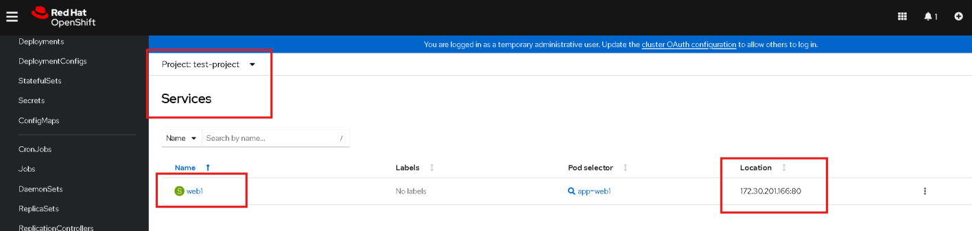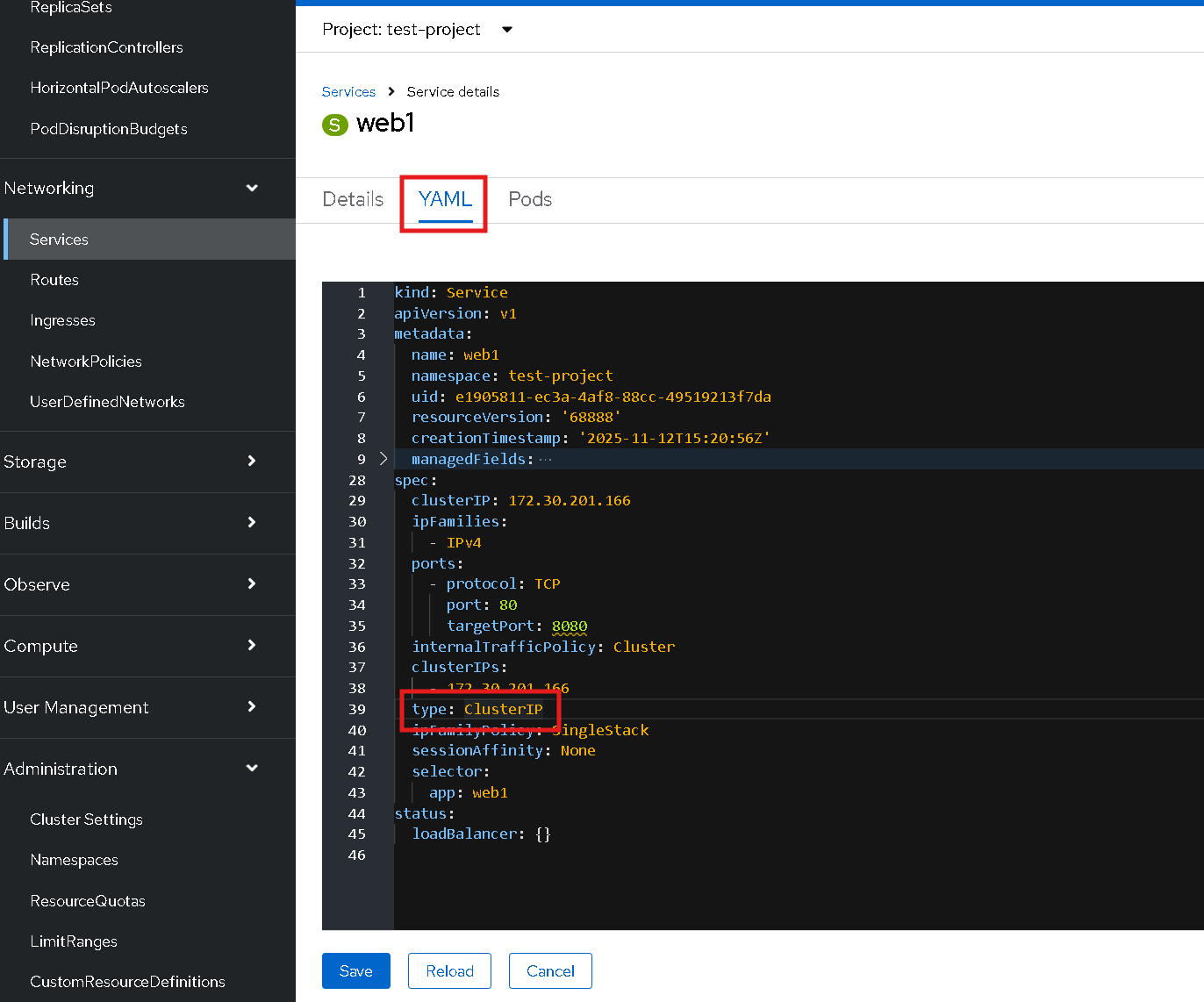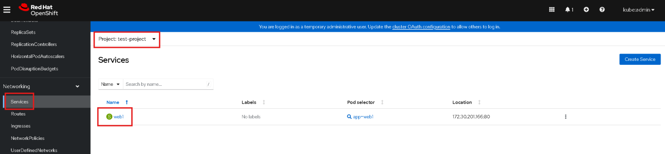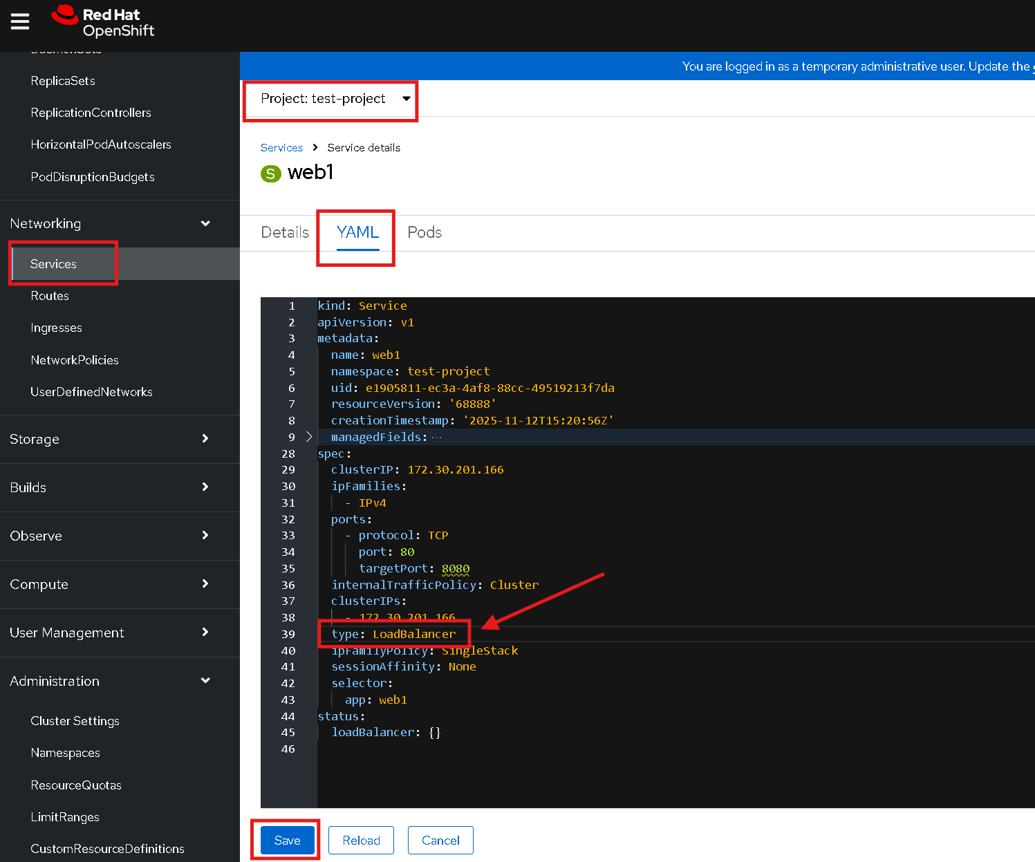 Openshift web arayüzünden “Networking – Services” bölümüne gelip “Project: test-project” seçiyoruz ve servis’i editlemek için tıklıyoruz: