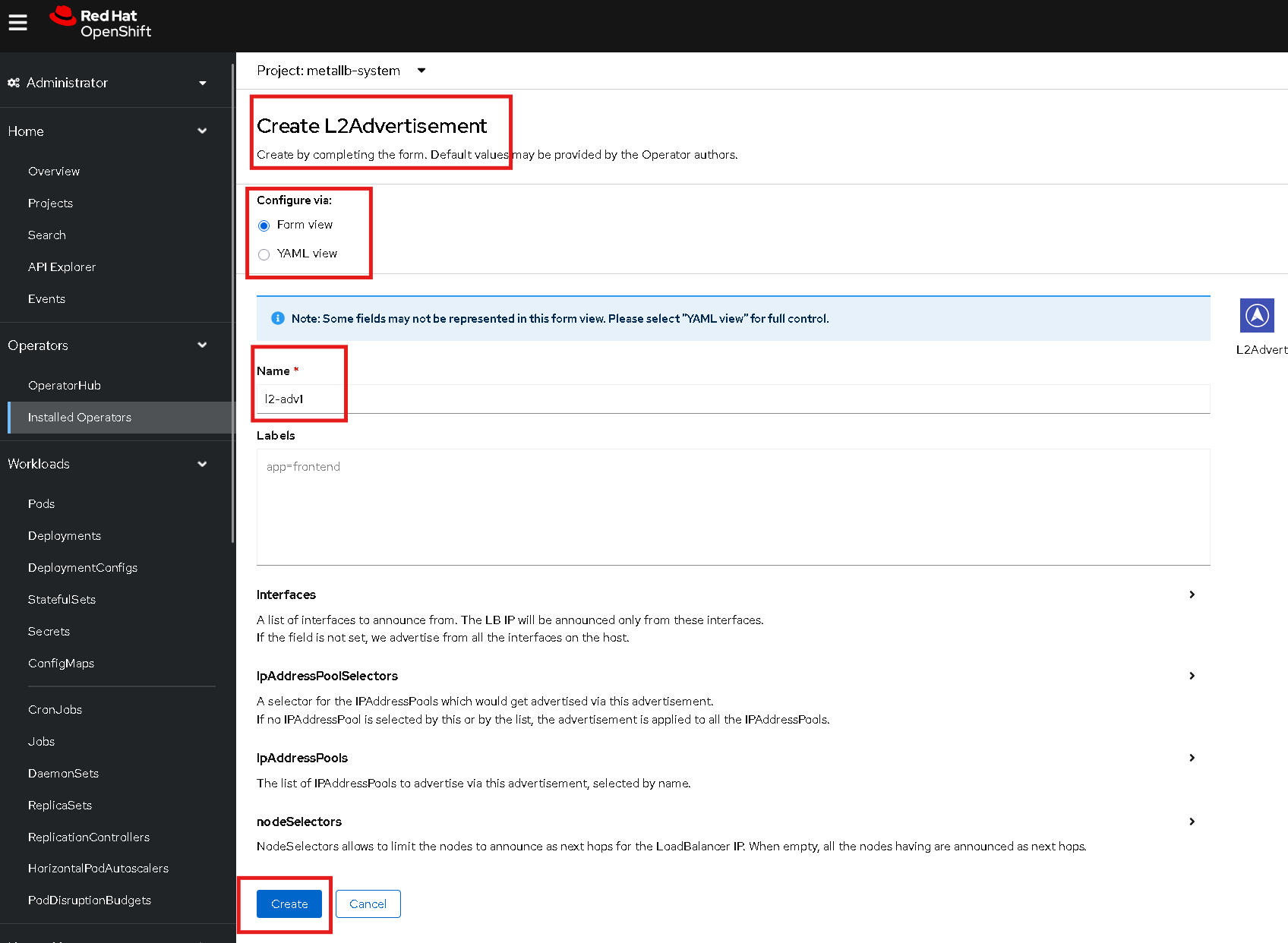 L2 protokolü kullanarak "IPAddressPool" dan gelen bir IP'yi tanımlayan L2Advertisement nesnesini yine Openshift Web arayüzünde MetalLB operatörü içerisinden “L2Advertisement” bölümünden oluşturabiliriz. Burada IPAddressPool adı olarak önceki bölümde oluşturulan IPAddressPool adını yazabiliriz: