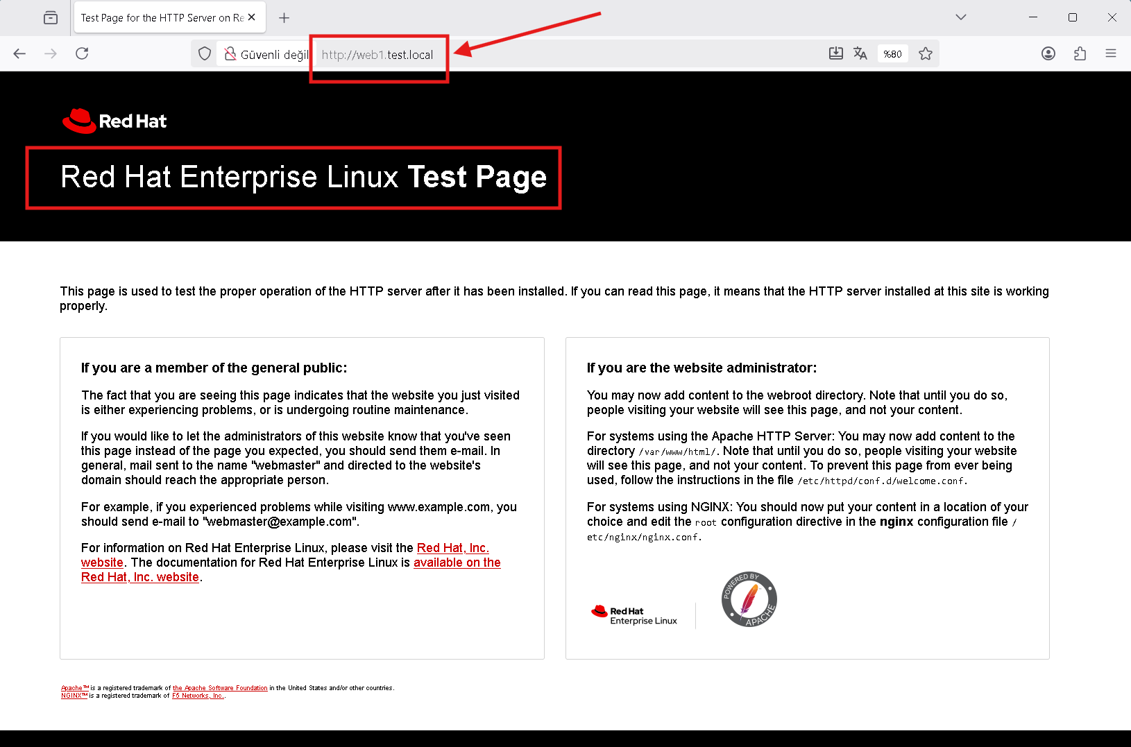 Artık bu IP (bu örnekte 192.168.1.55) kullanılarak bir DNS A Record oluşturulduğunda bu web uygulamasına dışarıdan erişilebilecektir, örneğin; http://web1.test.local gibi: