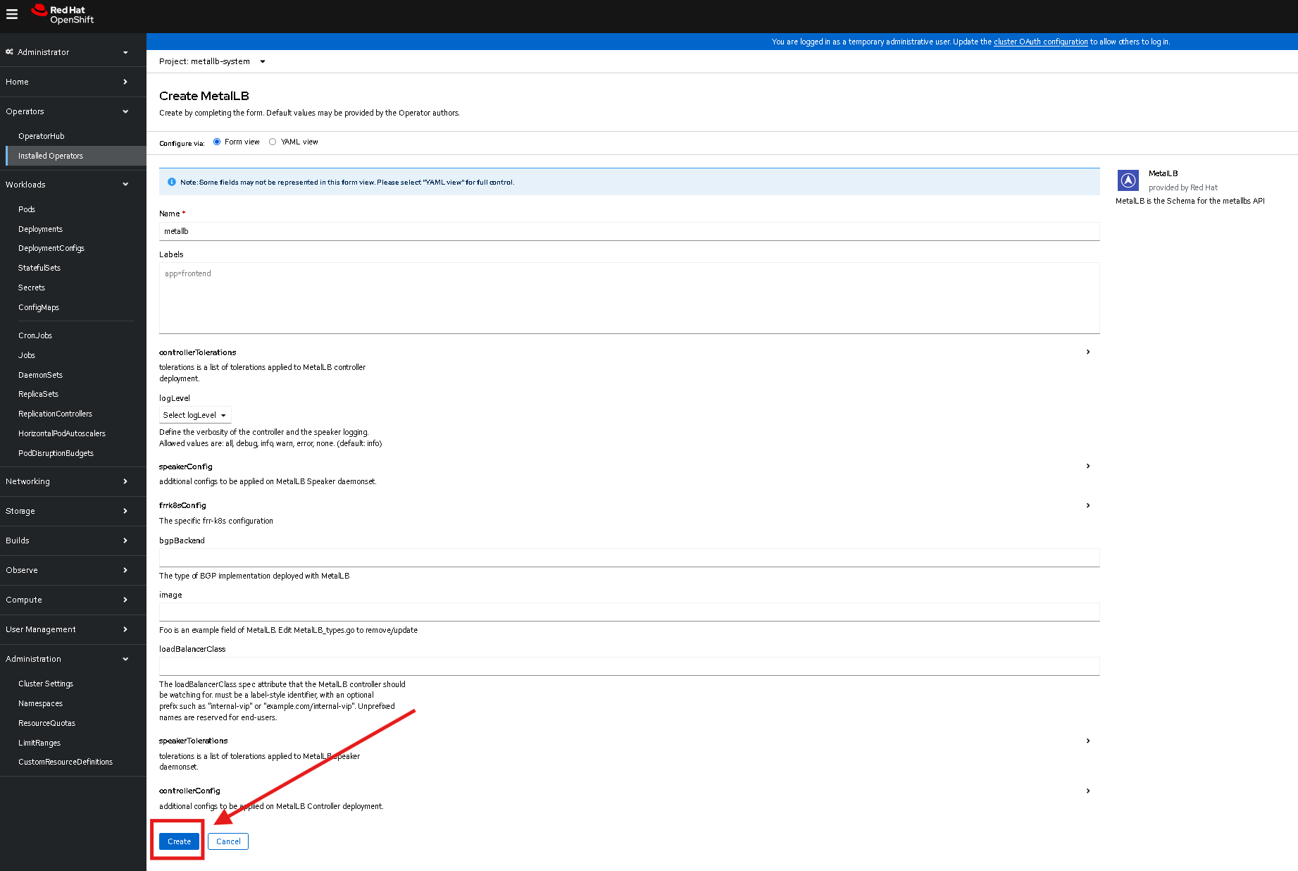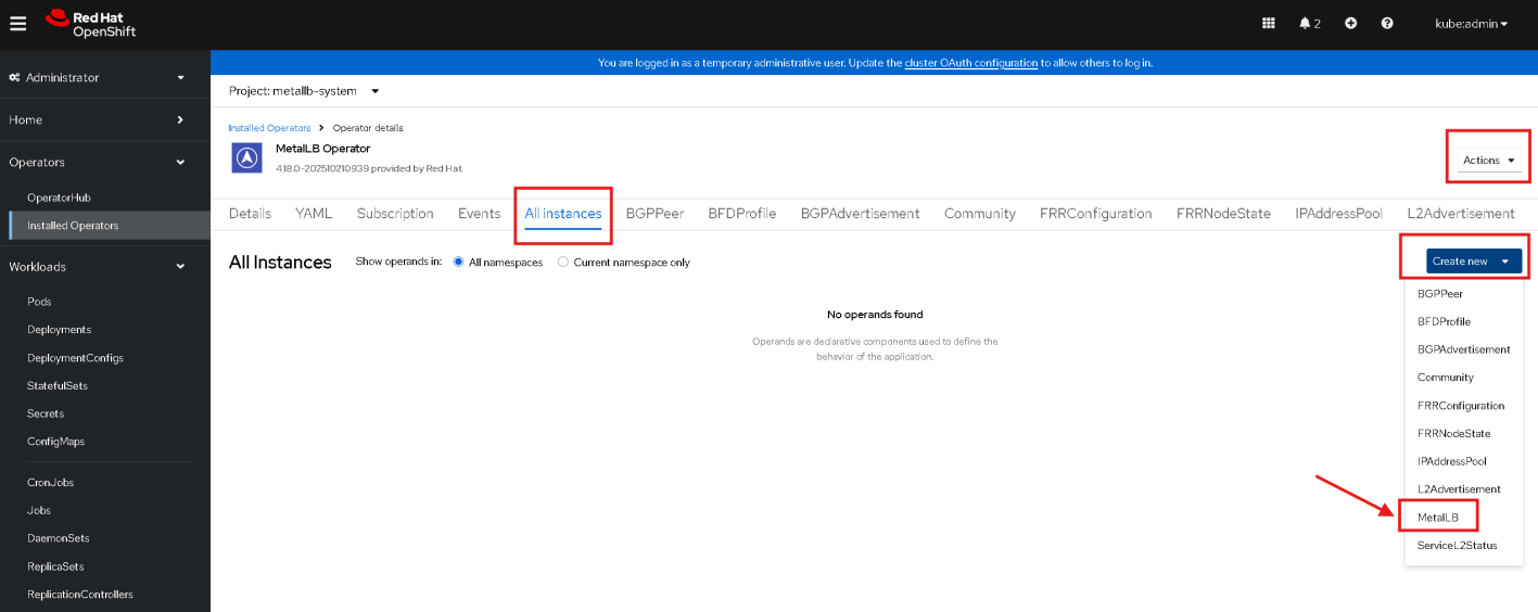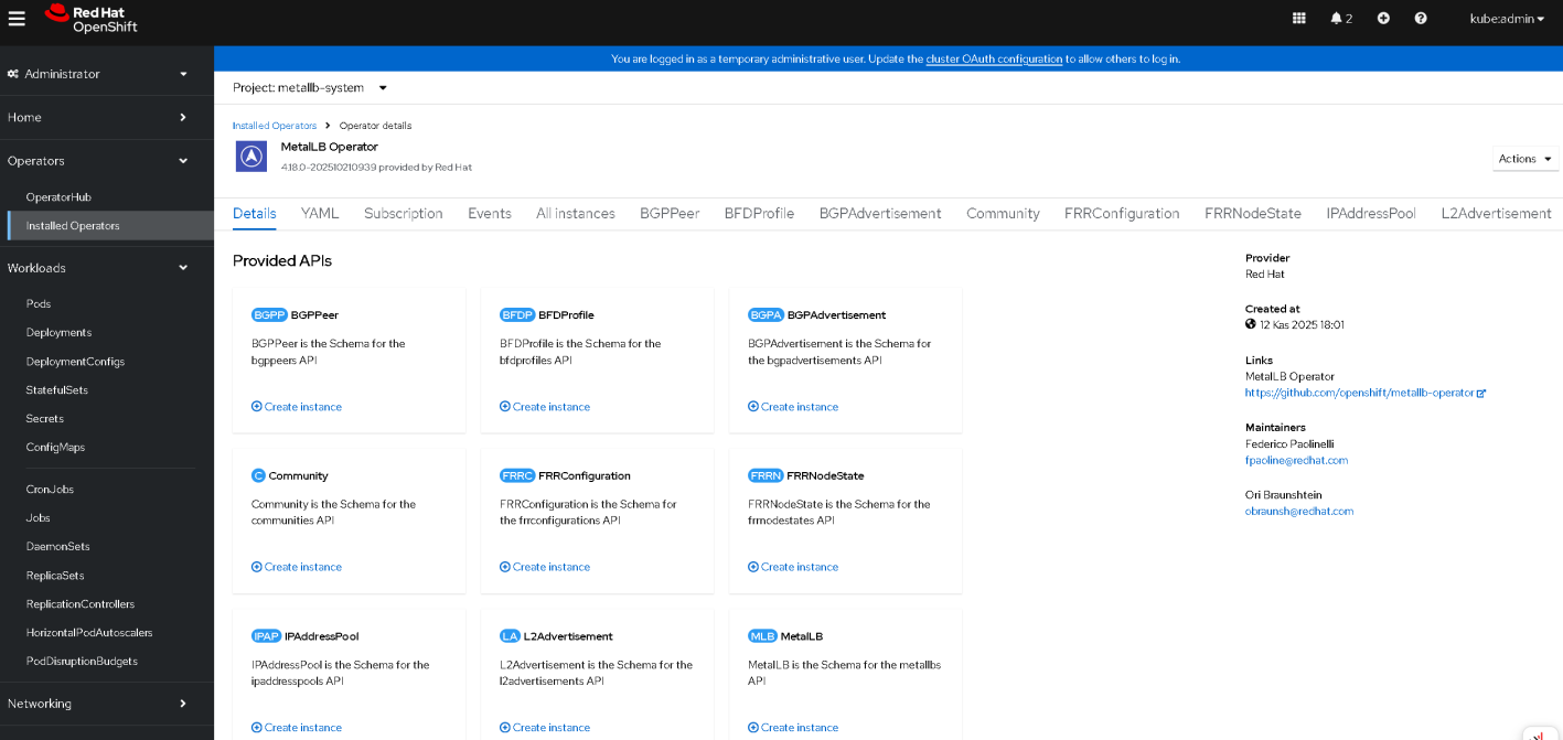 Operatör kurulumu tamamlanınca “All Instance” veya “MetalLB” sekmesinden bir “MetalLB” nesnesini seçip “create”’e basarak oluşturuyoruz: