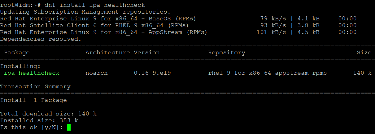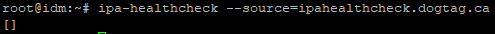 Healthcheck tool’u ile birlikte servislerin düzgün çalışıp çalışmadığını teyit edebiliriz. Tool IDM’de sssd, certmonger, httpd, dirsrv, gssproxy, ipa-custodia, ipa_dnskeysyncd, ipa_otpd, kadmin, krb5kdc, named, pki_tomcatd servislerini toplu bir şekilde kontrol eder. Bu kontrolü aşağıdaki komut ile yapabiliriz. Çıktının boş dönüyor olması bir hata olmadığını belirtir.