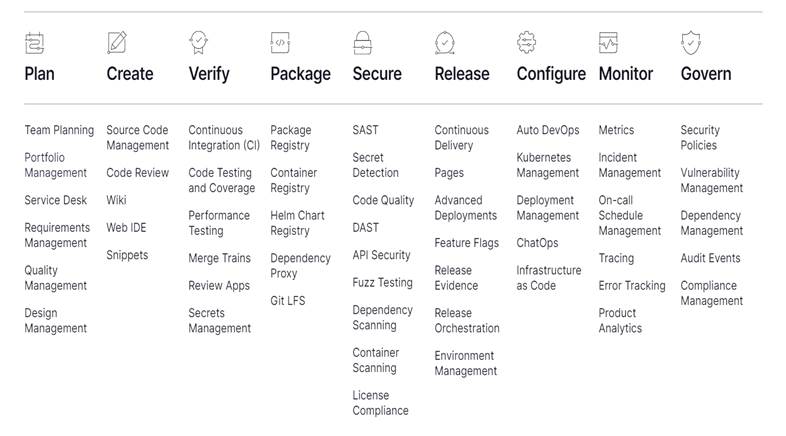 The services provided by GitLab are detailed in the image above. As seen here, GitLab enables the use of a single tool for tasks such as security, storage, monitoring, and more throughout the entire process from project planning to the final stages. This point is very important. Because, it can be a challenging task to integrate multiple tools to work together correctly for software developers. GitLab provides us great advantages in this respect. These configuration processes can be easily done with the user interface, and it can also be activated through the ".gitlab-ci.yml" file, which can be referred to as the brain of CI/CD processes.