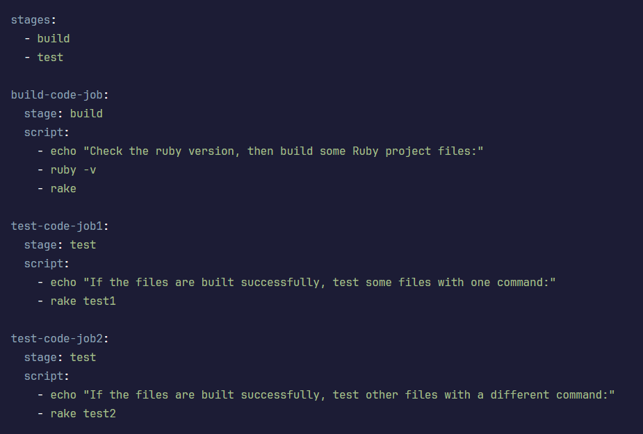 Firstly, the "build-code-job" within the "build stage" is executed. This job provides the output of the Ruby version and builds the project using the "rake" command. If this stage completes successfully, the "test-code-job" jobs start running in parallel, testing the specified files.