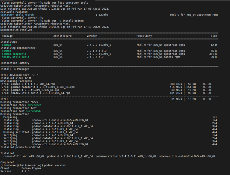 It is possible to download Podman in one line. RHEL 9 was used in this study. You can access the installations in other distributions and operating systems from this link.
