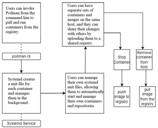 Users can automatically start and manage their own containers with their own systemd units. This allows each user to have separate sets of containers and images and enables simultaneous use of Podman on the same host machine. When users are done with their work, they can share their images with others by uploading the changes to a shared repository.
