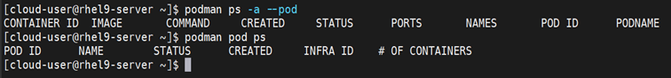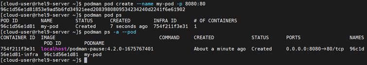 The infra container created with my-pod should now be listed by default. Additionally, the published ports of the pod are listed, and it is verified that port 80 is being forwarded to port 8080.