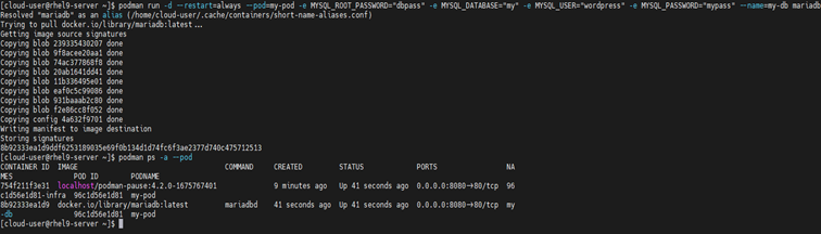 Ø podman run -d --restart=always --pod=my-pod -e MYSQL_ROOT_PASSWORD= “dbpass” -e MYSQL_DATABASE=”my” -e MYSQL_USER=”wordpress” -e MYSQL_PASSWORD=”mypass” –name=my-db mariadb