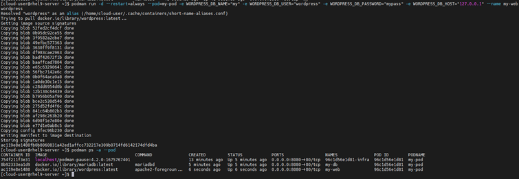 Ø podman run -d --restart=always --pod=my-pod -e WORDPRESS_DB_NAME = “my” -e WORDPRESS_DB_USER =” wordpress” -e WORDPRESS_DB_PASSWORD =”mypass” -e WORDPRESS_DB_HOST =”127.0.0.1” –name=my-web wordpress
