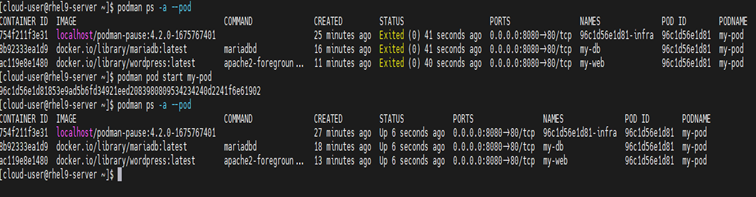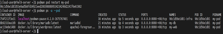 11. Use the "podman pod restart" command to restart the pod and its containers: